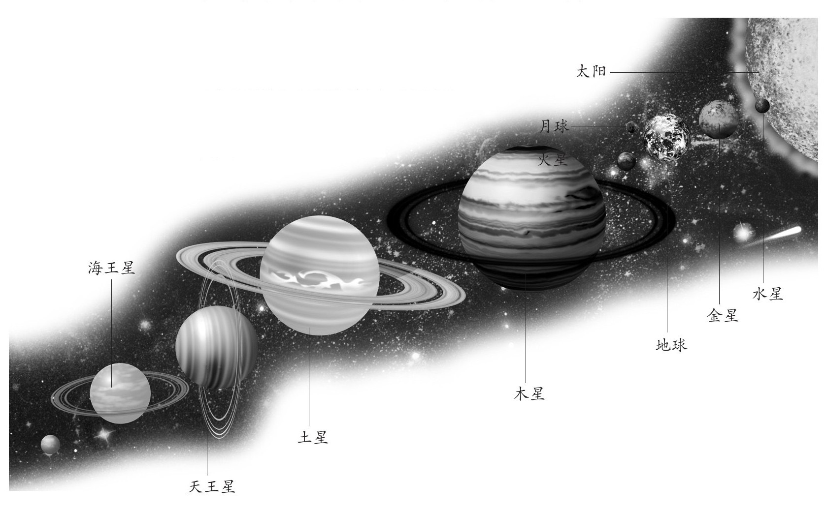 行星、卫星、小行星和彗星围着太阳旋转,就像围着篝火狂欢的人群。太阳和绕它旋转的各种天体一起组成了太阳系。