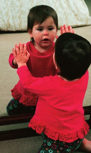 许多发展心理学家都调查研究过儿童何时和怎样获得他们自身的意识。在一个经典的实验中,幼小的儿童坐在一面镜子前,这样他们能看到他们自己。这时有人在每一个儿童的鼻子上点上一个小红点,但不让他们注意到,然后再让他们坐到镜前,儿童将看到一个不同的形象,当他们看到红点时,将会有什么反应呢?儿童去摸镜子还是去摸他们自己的鼻子?这类的实验已经大大地证明了拉肯的观点,即儿童首先在镜子中学习认识他们自身,然后学习镜像和他们自身之间的不同,这通常发生在大约18个月左右的儿童身上。然而,最近的研究表明,海豚和黑猩猩也能作出类似的反应,这说明语言不是必需的。