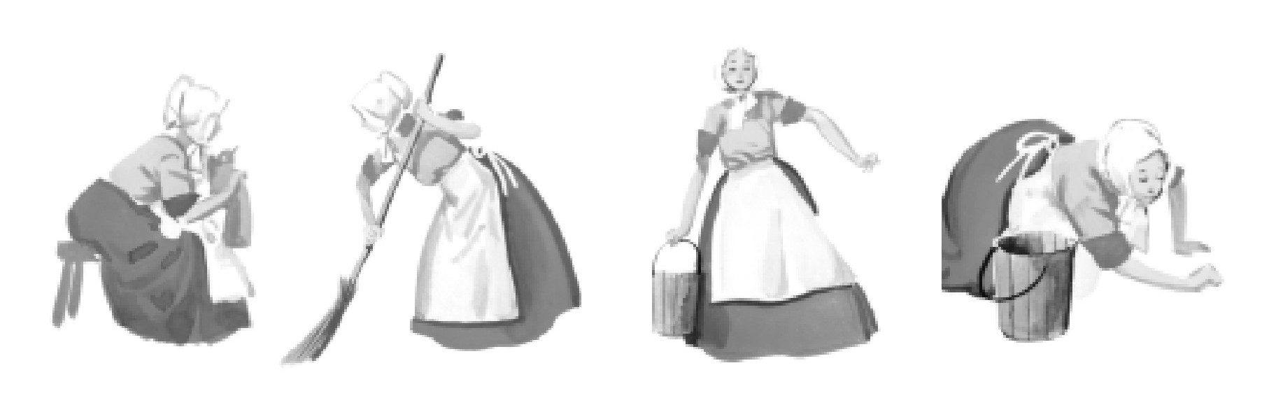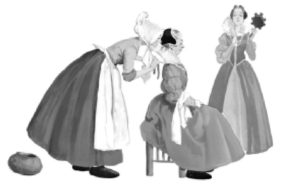 婚礼一结束,这个继母就开始显露出她本来的面目。她容不下这个年幼的女孩,因为她那些美好的品德和性格只会让她自己的两个女儿看上去更令人厌烦。于是,她命令这个可怜的女孩干所有的家务活。女孩每天不得不洗碗刷盘、擦洗楼梯,还要打扫女主人和她两个女儿的房间。她自己只能睡在阁楼里脏乱不堪的稻草堆里,那就是她的床。她的姐姐们却住在舒适的房间里:地板上镶嵌着美丽的图案,床铺也都按照最时髦的方式收拾得整整齐齐。她们的房间里面还有一面大镜子,可以从镜子里面从头到脚地欣赏自己。