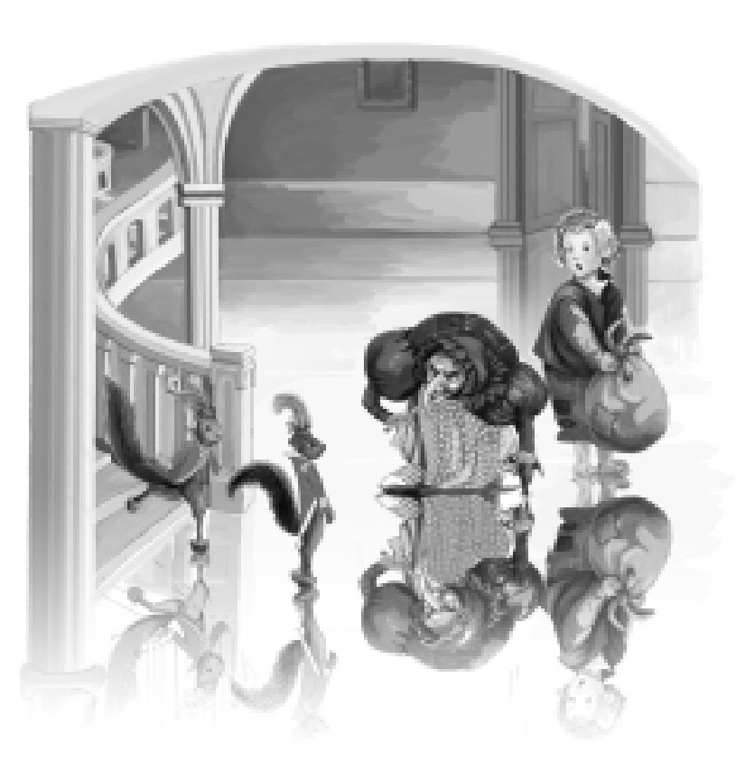 她走得很慢,差不多走了三刻钟才来到城里一个最偏僻的地方,最后在一座快要倒塌的小房子前站住了。她从衣袋里掏出一把生了锈的旧钥匙,灵巧地把它插进门上的一个小锁孔里,突然,咔嚓一声,门打开了。小雅各走进门去,马上惊呆了!房子里面装饰得富丽堂皇,天花板和墙壁都是用大理石砌成的,家具是用最美丽的黑檀木做的,上面镶着黄金和磨光的宝石,地板是用玻璃铺成的,光滑极了,以致小雅各滑倒了好几次。这时老太婆从衣袋里掏出一枝小银笛,吹起一首曲子,一种刺耳的声音在整个屋子里轰鸣。马上有几只豚鼠从楼梯上跑下来。雅各感到很奇怪,它们是用双腿直立行走的,脚上穿的不是鞋,而是核桃壳;身上穿着人的衣服,头上戴着最时髦的帽子。“你们这些混蛋,把我的拖鞋放到哪儿去了?”老太婆吼道,举起拐杖朝它们打去,打得它们吱吱直叫,乱蹦乱跳。“你们还要我在这儿站多久啊?”