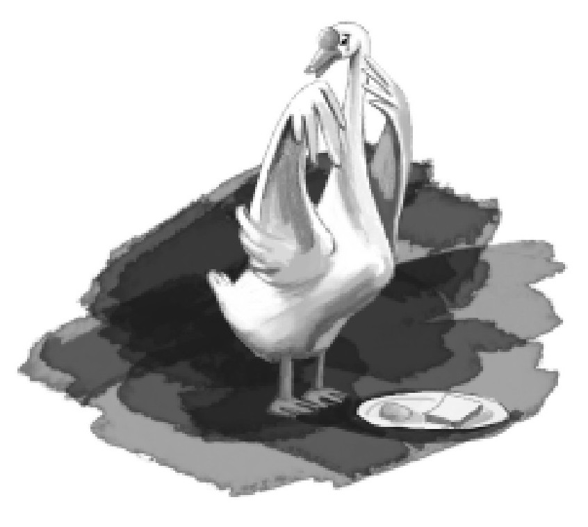 突然,他发现街角上有一排小贩,尽头坐着一个妇女。她也在卖鹅,但她不像其他小贩那样大声吆喝,夸耀自己的鹅好,招徕顾客。于是,他走到这个女贩面前,打量了一下她的鹅,然后拿在手里掂掂分量。这些鹅正合他的要求,于是,他把三只鹅连同笼子一起买下了,扛在宽阔的肩膀上,向宫里走去。他忽然发现,三只鹅中只有两只嘎嘎地叫,像是真正的鹅,而第三只却静静地坐在笼子里,只是轻声叹气,像是人在呻吟,他感到很奇怪。“这只鹅大概有病,”他自言自语地说,“我得赶快回去,把它宰了做成菜。”可是,这只鹅却用清晰而洪亮的声音回答说: