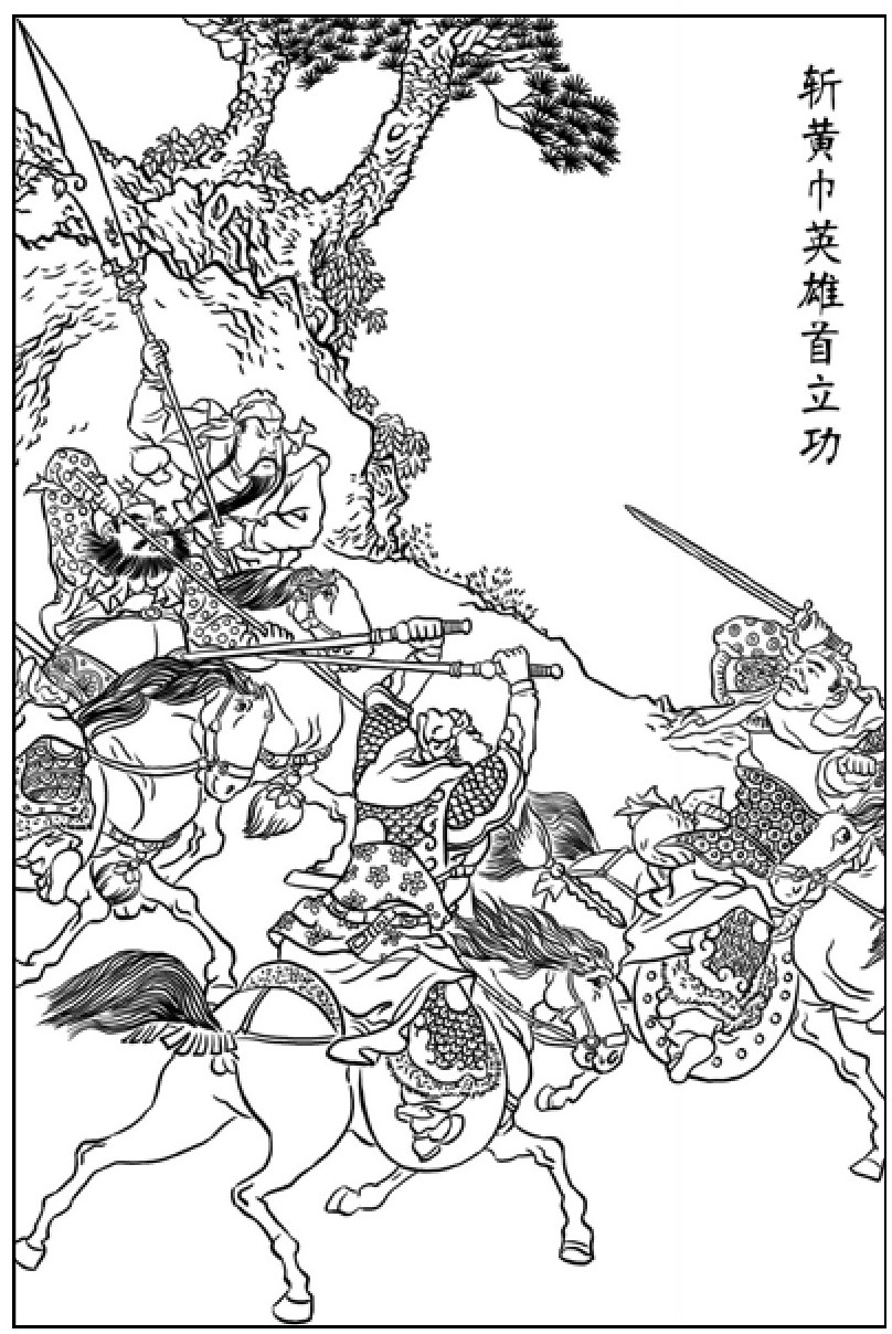 不数日,人报黄巾贼将程远志统兵五万来犯涿郡。刘焉令邹靖引玄德等三人,统兵五百,前去破敌,玄德等欣然领军前进,直至大兴山下,与贼相见。贼众皆披发,以黄巾抹额。当下两军相对,玄德出马,左有云长,右有翼德,扬鞭大骂:“反国逆贼,何不早降!”程远志大怒,遣副将邓茂出战。张飞挺丈八蛇矛直出,手起处,刺中邓茂心窝,翻身落马。程远志见折了邓茂,拍马舞刀,直取张飞。云长舞动大刀,纵马飞迎。程远志见了,早吃一惊,措手不及,被云长刀起处,挥为两段。后人有诗赞二人曰: