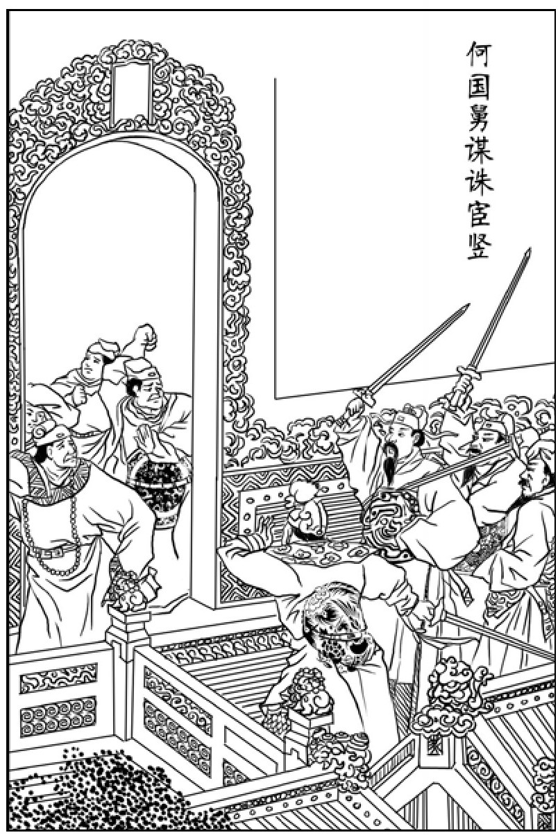 六月,何进暗使人酖杀董后于河间驿庭,举柩回京,葬于文陵。进托病不出。司隶校尉袁绍入见进曰:“张让、段珪等流言于外,言公鸩杀董后,欲谋大事。乘此时不诛阉宦,后必为大祸。昔窦武欲诛内竖,机谋不密,反受其殃。今公兄弟部曲将吏,皆英俊之士;若使尽力,事在掌握。此天赞之时,不可失也。”进曰:“且容商议。”左右密报张让,让等转告何苗,又多送贿赂。苗入奏何后云:“大将军辅佐新君,不行仁慈,专务杀伐。今无端又欲杀十常侍,此取乱之道也。”后纳其言。少顷,何进入白后,欲诛中涓。何后曰:“中官统领禁省,汉家故事。先帝新弃天下,尔欲诛杀旧臣,非重宗庙也。”进本是没决断之人,听太后言,唯唯而出。袁绍迎问曰:“大事若何?”进曰:“太后不允,如之奈何?”绍曰:“可召四方英雄之士,勒兵来京,尽诛阉竖。此时事急,不容太后不从。”进曰:“此计大妙!”便发檄至各镇,召赴京师。主簿陈琳曰:“不可!俗云:‘掩目而捕燕雀’,是自欺也。微物尚不可欺以得志,况国家大事乎?今将军仗皇威,掌兵要,龙骧虎步,高下在心:若欲诛宦官,如鼓洪炉燎毛发耳。但当速发雷霆,行权立断,则天人顺之。却反外檄大臣,临犯京阙,英雄聚会,各怀一心:所谓倒持干戈,授人以柄,功必不成,反生乱矣。”何进笑曰:“此懦夫之见也!”旁边一人鼓掌大笑曰:“此事易如反掌,何必多议!”视之,乃曹操也。正是:欲除君侧宵人乱,须听朝中智士谋。不知曹操说出甚话来,且听下文分解。