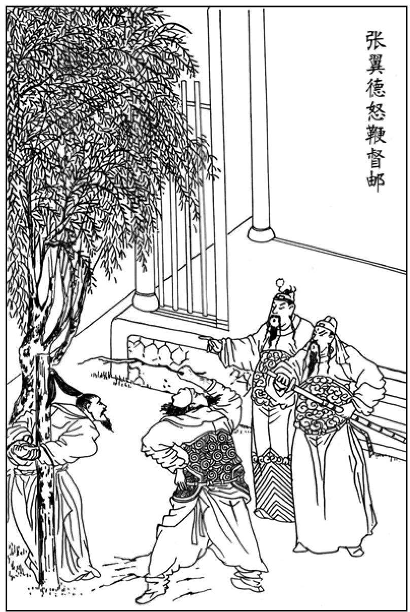 却说张飞饮了数杯闷酒,乘马从馆驿前过,见五六十个老人,皆在门前痛哭。飞问其故。众老人答曰:“督邮逼勒县吏,欲害刘公;我等皆来苦告,不得放入,反遭把门人赶打!”张飞大怒,睁圆环眼,咬碎钢牙,滚鞍下马,径入馆驿,把门人那里阻挡得住,直奔后堂,见督邮正坐厅上,将县吏绑倒在地。飞大喝:“害民贼!认得我么?”督邮未及开言,早被张飞揪住头发,扯出馆驿,直到县前马桩上缚住;攀下柳条,去督邮两腿上着力鞭打,一连打折柳条十数枝。玄德正纳闷间,听得县前喧闹,问左右,答曰:“张将军绑一人在县前痛打。”玄德忙去观之,见绑缚者乃督邮也。玄德惊问其故。飞曰:“此等害民贼,不打死等甚!”督邮告曰:“玄德公救我性命!”玄德终是仁慈的人,急喝张飞住手。旁边转过关公来,曰:“兄长建许多大功,仅得县尉,今反被督邮侮辱。吾思枳棘丛中,非栖鸾凤之所;不如杀督邮,弃官归乡,别图远大之计。”玄德乃取印绶,挂于督邮之颈,责之曰:“据汝害民,本当杀却;今姑饶汝命。吾缴还印绶,从此去矣。”督邮归告定州太守,太守申文省府,差人捕捉。玄德、关、张三人往代州投刘恢。恢见玄德乃汉室宗亲,留匿在家不题。