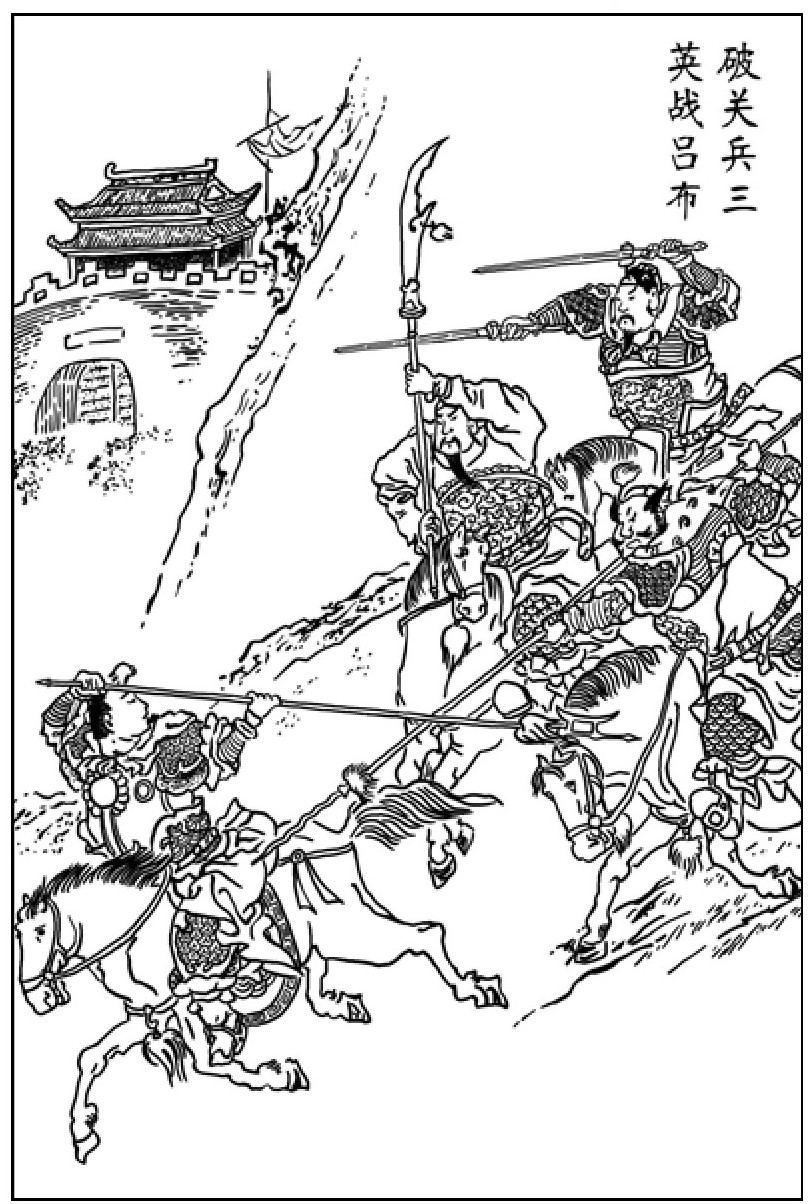 正议间,吕布复引兵搦战。八路诸侯齐出。公孙瓒挥槊亲战吕布。战不数合,瓒败走。吕布纵赤兔马赶来。那马日行千里,飞走如风。看看赶上,布举画戟望瓒后心便刺。旁边一将,圆睁环眼,倒竖虎须,挺丈八蛇矛,飞马大叫:“三姓家奴休走!燕人张飞在此!”吕布见了,弃了公孙瓒,便战张飞。飞抖擞精神,酣战吕布。连斗五十余合,不分胜负。云长见了,把马一拍,舞八十二斤青龙偃月刀,来夹攻吕布。三匹马丁字儿厮杀。战到三十合,战不倒吕布。刘玄德掣双股剑,骤黄鬃马,刺斜里也来助战。这三个围住吕布,转灯儿般厮杀。八路人马,都看得呆了。吕布架隔遮拦不定,看着玄德面上,虚刺一戟,玄德急闪。吕布荡开阵脚,倒拖画戟,飞马便回。三个那里肯舍,拍马赶来。八路军兵,喊声大震,一齐掩杀。吕布军马望关上奔走;玄德、关、张随后赶来。古人曾有篇言语,单道着玄德、关、张三战吕布: