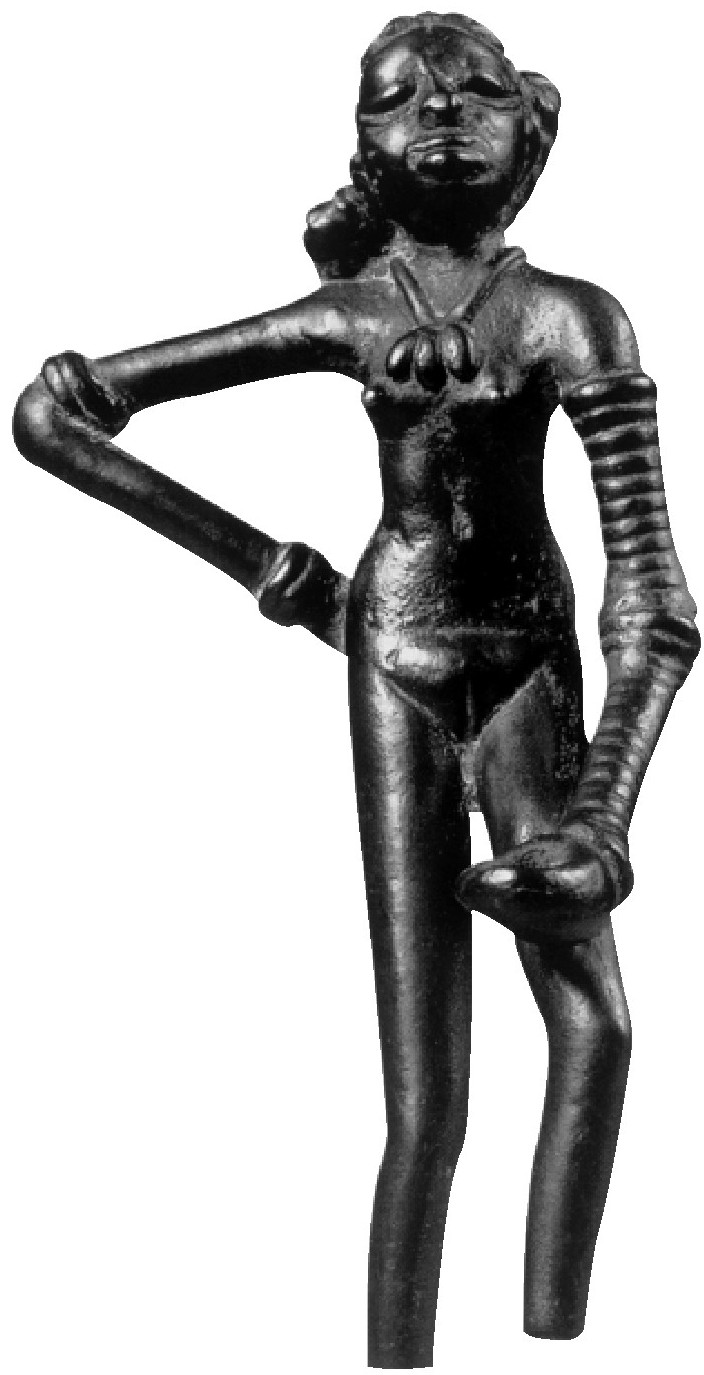 古城出土了数百件奇异的人形陶俑,描绘了当时的“圣母”祭祀仪式,体现了古摩亨佐·达罗人的艺术创作特点,表现了他们对“神力”的敬畏和虔诚。出土文物中有一尊似是教王一类首领人物的塑像,头系发带,面蓄胡须,左肩上斜搭一件饰有三瓣花图案的大氅,双目微睁,显出沉思的模样。另一件精巧的文物珍品是一个舞女的塑像,全身赤裸,叉腰翘首,栩栩如生,一副高傲尊严的神态。此外还出土了大量石制印章、陶器、青铜器皿等文物。印章上刻有牛、鱼和树木的图形文字,很像古埃及的象形文字和苏美尔人的楔形文字。不过,遗憾的是,这些“天书”至今还没有被人们识读。