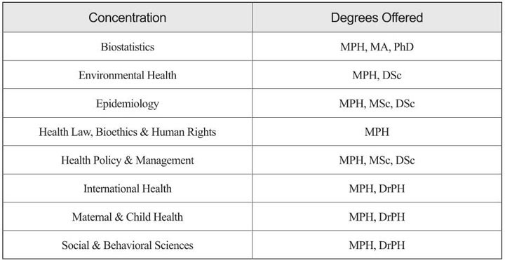 约翰·斯霍普金斯大学的彭博公共卫生学院创建于1916年,目前有来自78个国家的2056名学生。学院教学和科研实力雄厚,拥有全职教授529人。学院设有完整的公共卫生教学与研究体系,下设卫生、行为与社会(Health, Behavior and Society),生物化学与分子生物学(Biochemistry and Molecular Biology),生物统计学(Biostatistics),环境卫生科学(Environmental Health Sciences),传染病学(Epidemiology),卫生政策与管理(Health Policy and Management),世界卫生(International Health),心理健康(Mental Health),分子微生物学与免疫学(Molecular Microbiology and Immunology),以及人口、家庭与生殖卫生(Population, Family and Reproductive Health)共10个系。