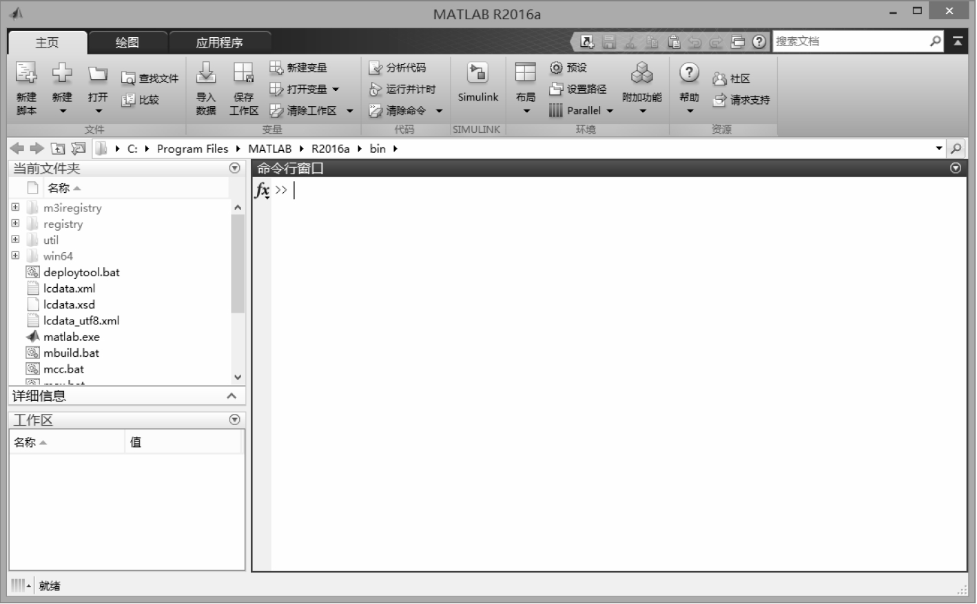 双击位于MATLAB R2016a的安装目录内的bin文件夹下的MATLAB.exe图标,启动MATLAB,出现启动界面;启动结束后,桌面弹出MATLAB R2016a的用户界面,如图1.1所示。