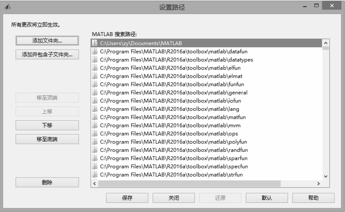 选择MATLAB主界面主页标签下菜单栏中环境菜单下的设置路径菜单,弹出设置路径对话框,如图1.8所示。该对话框分为左右两部分,左侧的几个按钮用来添加目录到搜索路径,还可以从当前的搜索路径中移除选择的目录;右侧的列表框列出了已经被MATLAB添加到搜索路径的目录。