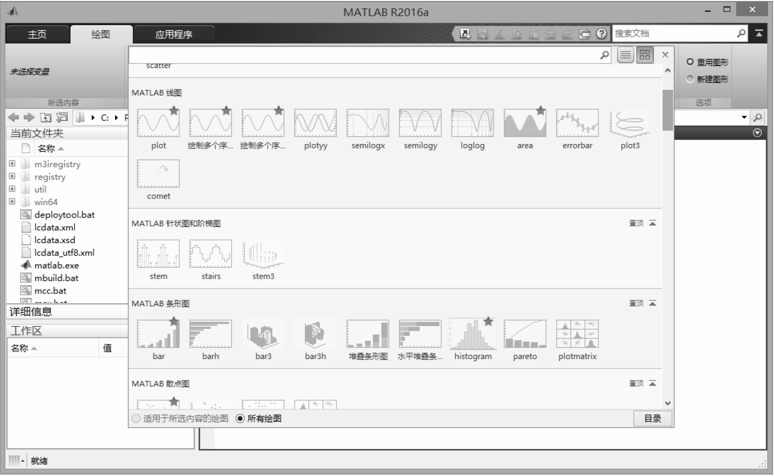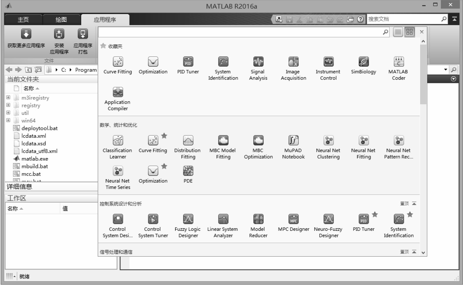 单击主界面标签栏的应用程序标签可以快捷地打开应用列表,典型的MATLAB R2016a包含的应用包括: