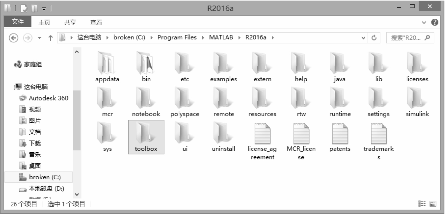 在计算机上成功安装了MATLAB R2016a后,在安装目录内包含一系列的文件和文件夹,如图1.6所示。
