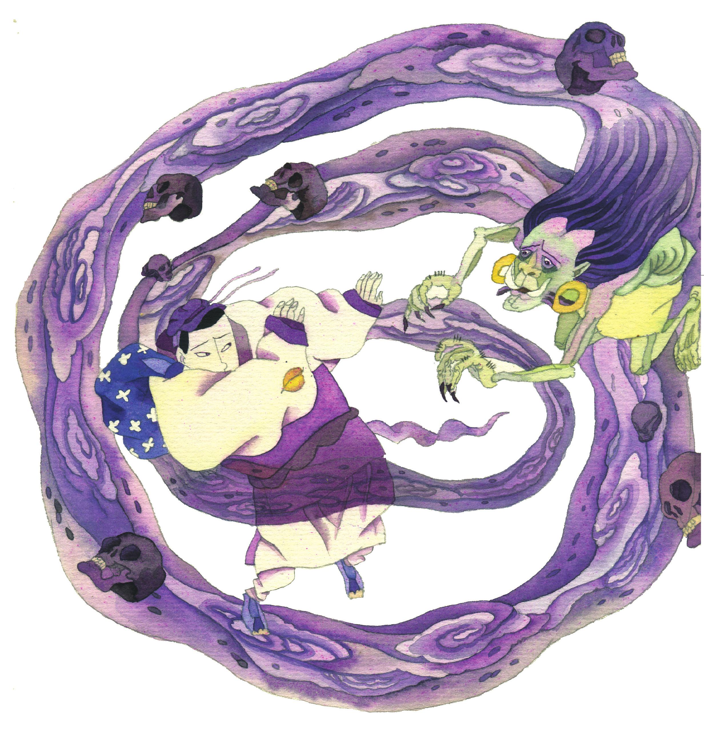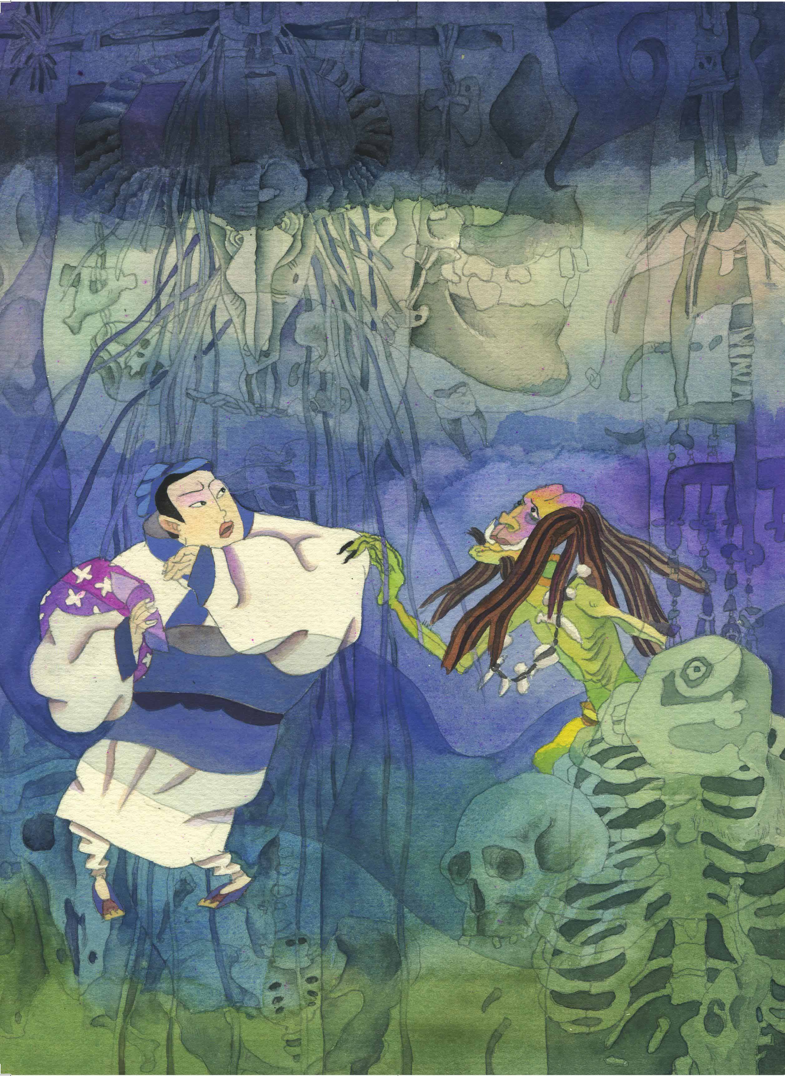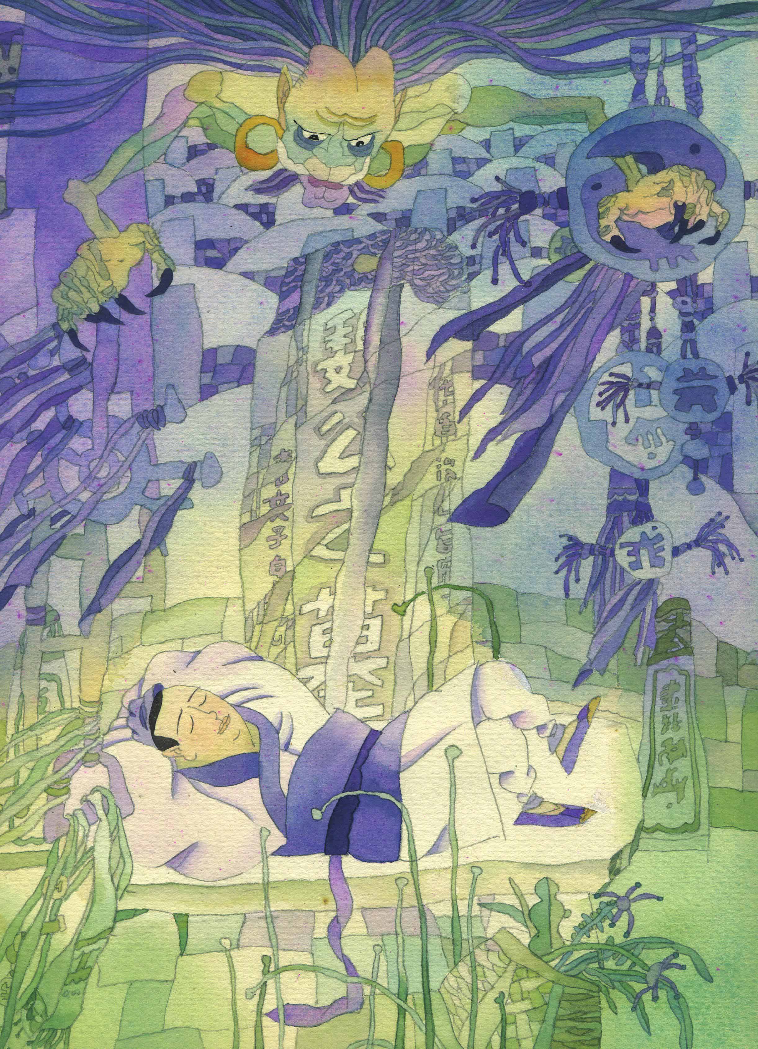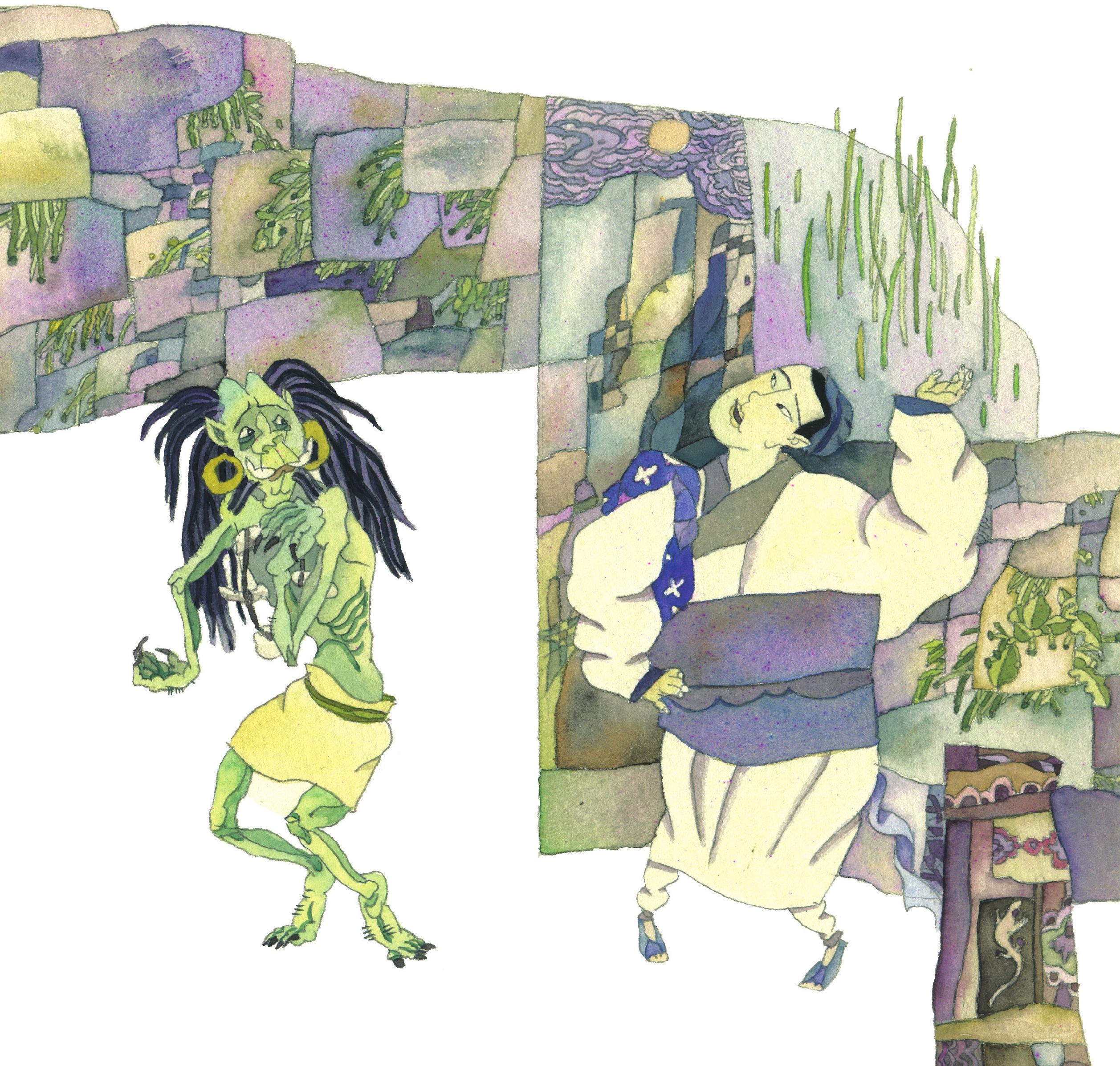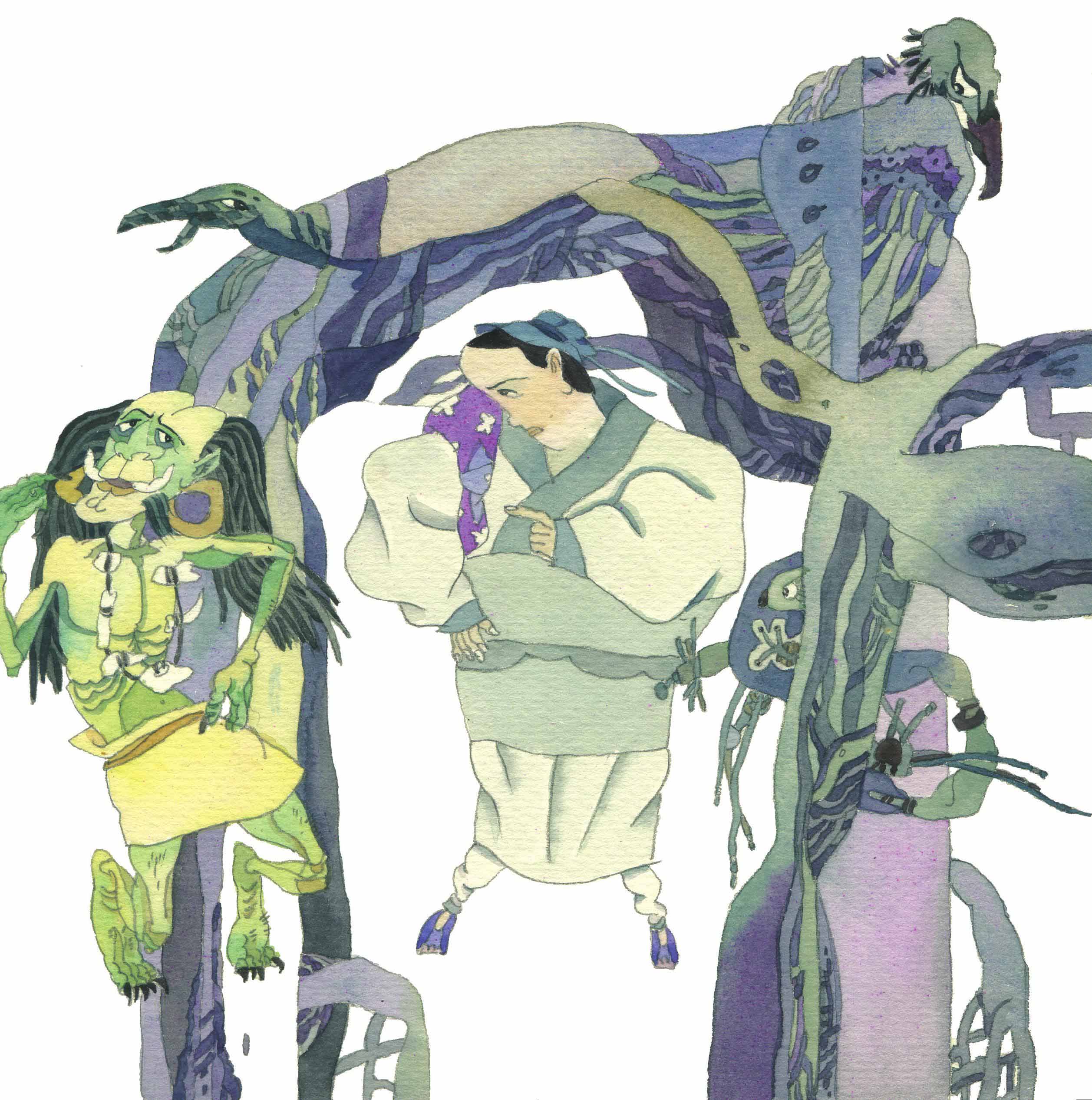他凑近几步仔细看,嚄!这家伙面孔青的青,白的白,没有一丁点儿血色,两只眼“突突”得好像冒绿火,又张嘴来又吐舌,两只獠牙像尖刀,一边一个刺啦着。他恶狠狠地扑过来,看样子要掐宋定伯。