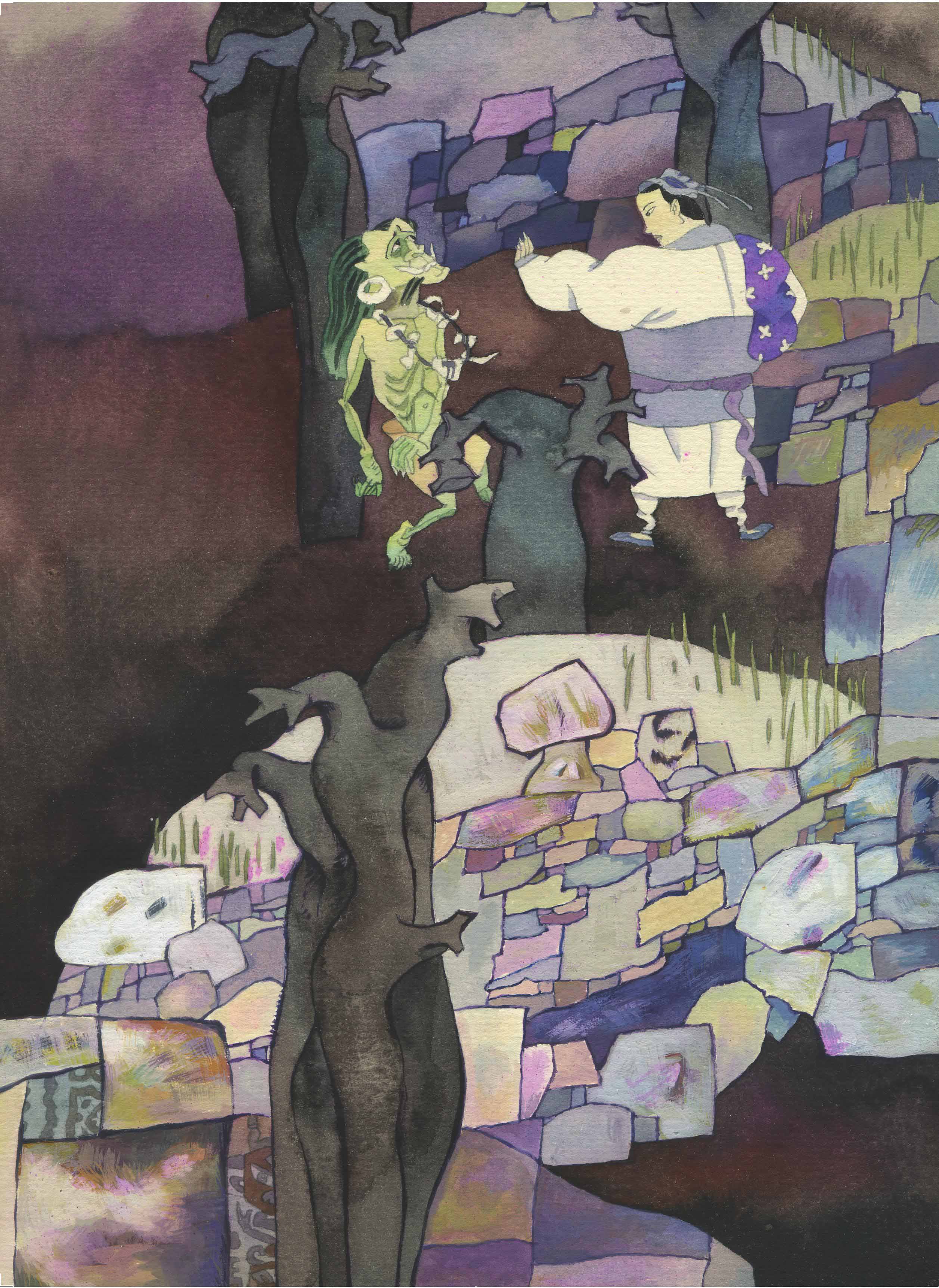 他凑近几步仔细看,嚄!这家伙面孔青的青,白的白,没有一丁点儿血色,两只眼“突突”得好像冒绿火,又张嘴来又吐舌,两只獠牙像尖刀,一边一个刺啦着。他恶狠狠地扑过来,看样子要掐宋定伯。