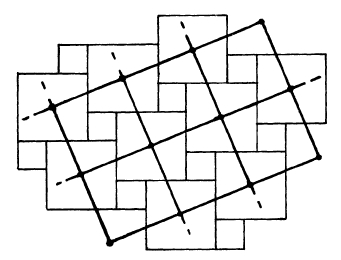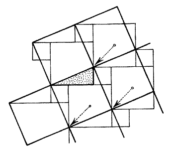 首先,我们来考虑图2.2所示的图形。它由两个不同大小的正方形组成。很“显然”,这种图案可以无限连续地重复铺排下去,以致不留缝隙亦不重叠地铺满整个平面。图案的这种重复性还反映了这样一个事实:如果我们标出大正方形的中心,则这些中心组成另一个更大的正方形体系的各个顶点,这个更大的正方形较原先的那两种有一个倾角(图2.3),它能够单独覆盖整个平面。我们也可以以严格相同的方式对每个斜正方形进行标线,使得这些正方形的标线拟合成原先的两个正方形图案。如果我们不是取原先两个正方形中较大的那个的中心,而是取其他任意点,然后将每块上相应的点按上述方式标出并连接起来,我们同样能够得到覆盖整个平面的倾斜正方形图案,新图案的大小、倾角与前述的斜正方形完全相同,只不过不加转动地移动了一个位置——即经过了所谓的 平移 。为简单计,我们将这个起始点选定为原图案的一个角上(图2.4)。