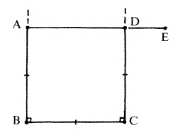 图2.7 试构造一个正方形。取∠ABC和∠BCD为直角,线段AB=BC=CD。我们要问:DA与这些线段等长吗?∠DAB和∠CDA也是直角吗?