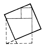 显然,斜正方形的面积必等同于两较小的正方形的面积和——我们可以沿前述的标线将斜正方形裁成小块,然后不加转动地移动各小块直到恢复成原先的两小正方形(例如图2.5)。此外,从图2.4还可以看出,大的斜正方形的边长是一个直角三角形的斜边长,而这个直角三角形的另两条边的边长则正好分别是两个小正方形的边长。由此我们得到毕达哥拉斯定理:直角三角形斜边的平方等于另两边的平方和。