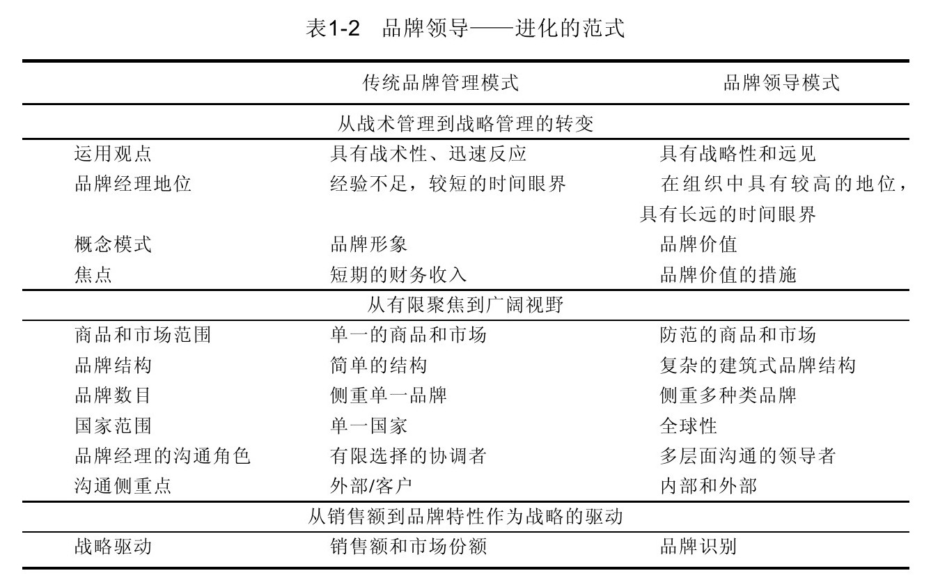 因此,一个新的模式逐渐地对宝洁及其他公司所运用的传统品牌管理体系进行了取代。我们把这个新兴的模式叫做品牌领导模式,该模式和传统模式有很大的不同。如表1-2总结的,它既强调战术也强调战略,它的应用范围很广,并且同时为品牌识别和销售所驱动。