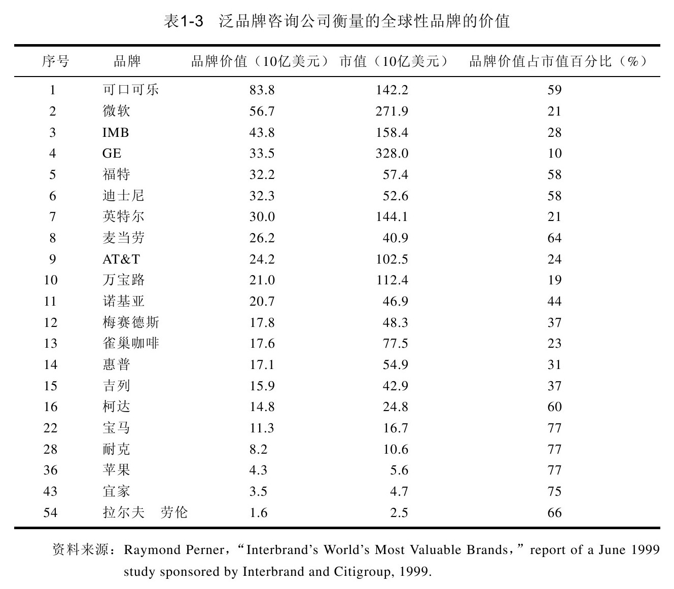 泛品牌咨询公司(Interbrand)在上述逻辑的基础上进行提炼,创造出其自有的品牌价值研究方法。该公司在1999年6月对其本土以外拥有重大市场影响力的品牌进行研究发现,全球最大品牌的价值让人瞠目结舌。表1-3列举了排名前15的品牌和其他6个品牌,这些品牌的价值甚至高于其企业的市值。