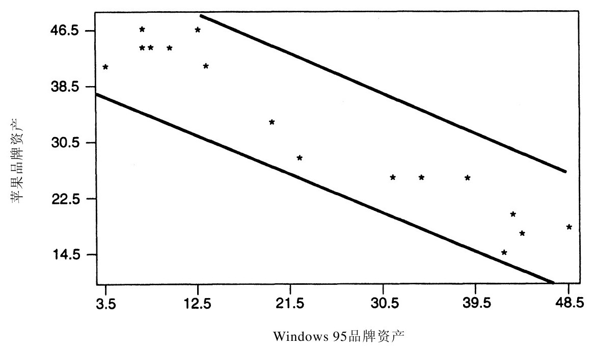 ■竞争对手行为。惠普的品牌资产曾经历了急剧下跌,在一定程度上就是受到其竞争对手佳能猛烈广告攻势的影响。Windows 95对苹果品牌资产的影响也是十分巨大的(见图1-3),Windows 95品牌资产的提升以及它对苹果的用户友好界面的压制,都是该影响的体现。事实上,这一结果正是微软所要达到的战略和战术目标。