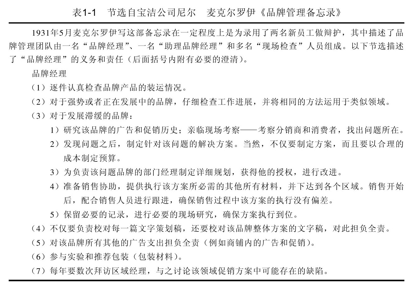 麦克尔罗伊的《品牌管理备忘录》(见表1-1,节选)详细地阐述了问题的解决方案——品牌管理小组的建立。该备忘录指出,一个品牌的管理团队必须负责品牌营销计划的制订并保证计划能与制造和销售相统一。这个基于宝洁公司内部和外部很多人理念和实践总结的备忘录,后来对于全球的企业如何去管理自己的品牌产生了深远的影响。