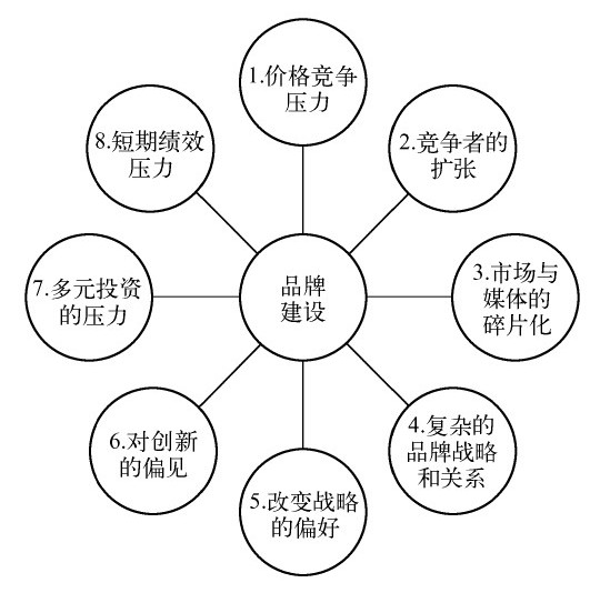 为达到这一目标,我们将探讨造成品牌建设困难的8个因素(如图1-7所示)。第一是价格竞争压力,它直接影响品牌建设的动机。第二是竞争者的扩张,它减少了定位的选择以及实施的有效性。第三和第四分别是市场与媒体的碎片化以及多品牌和多产品的卷入,这是当今品牌建设的环境,也是一个日益复杂的环境。