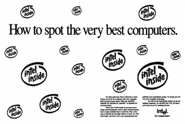 这一广告运动起初每年的预算为1亿美元,它在各个层面上都发挥了作用。在18个月里,共产生了9万页的广告,可以转化为100亿次潜在曝光。在此期间,英特尔在商业终端用户的再认度从46%上升到80%。而纽特健康糖在其标志曝光数年后才达到这一水平。如果以一个价格来衡量,就是让消费者接受一台不含英特尔处理器的电脑所要提供的折扣,英特尔的品牌资产无疑受到了积极影响。1992年,也是Intel Inside广告运动的第一个完整年度,英特尔的全球销量飙升了63%。