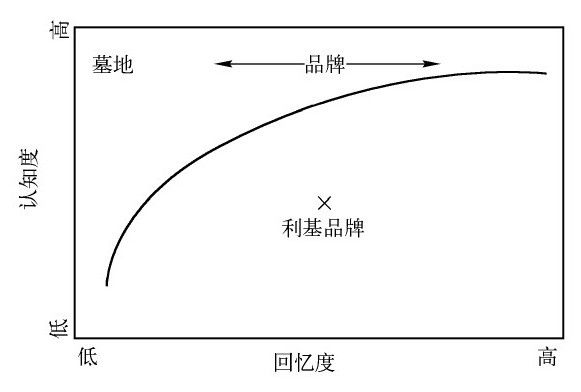 第二种例外情况是墓地,位于左上角,主要是那些再认度较高但回忆度很低的品牌。处于墓地位置非常危险:消费者知道这些品牌,但考虑购买时却想不起来。逃离墓地会受到高再认度的阻碍,因为人们没有理由去听一个熟悉品牌的什么故事,无论这个故事多么新颖。墓地模型的观点之一就是高再认度并不一定是强大品牌的标志,它同样与弱势品牌相伴。