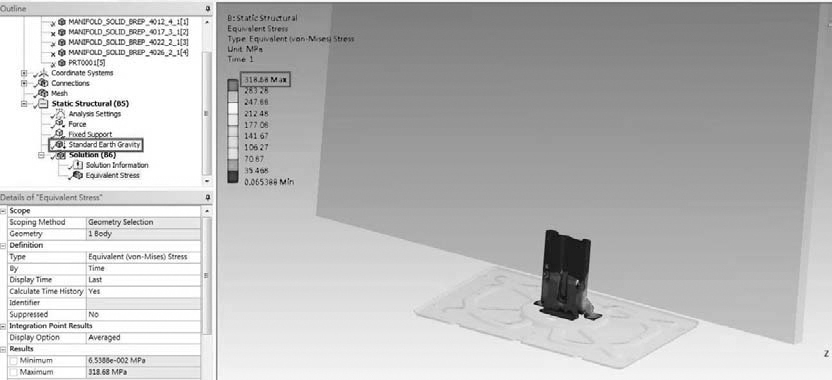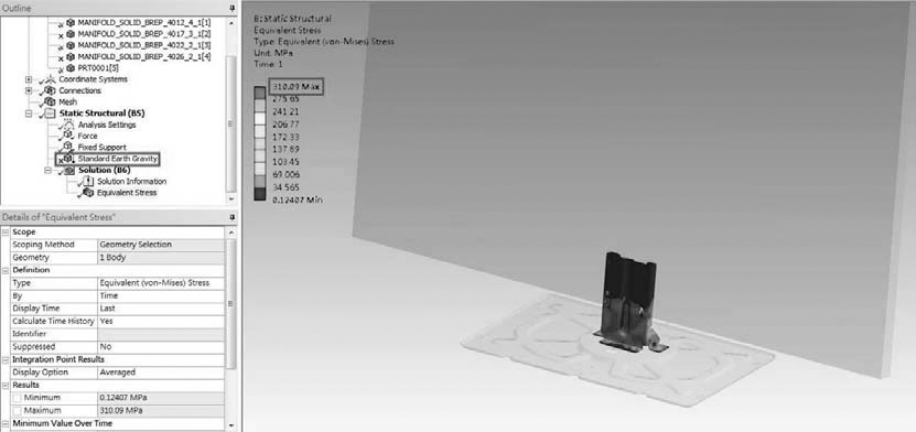 本例采用静力学分析,分析方法1添加重力加速度,等效应力值为318.68MPa,如图1-3-3所示;分析方法2不添加重力加速度,等效应力值为310.09MPa,如图1-3-4所示。试问在这个分析中是否应该加载重力加速度?