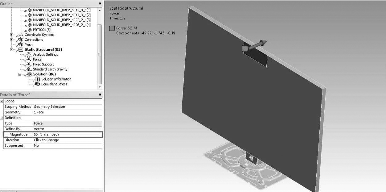 例如,一台液晶电视机受力分析,已知条件如图1-3-1所示:底盘固定,液晶电视机质量为62.8kg;载荷如图1-3-2所示:在方块区域加载50N;求底座支撑架应力值大小?