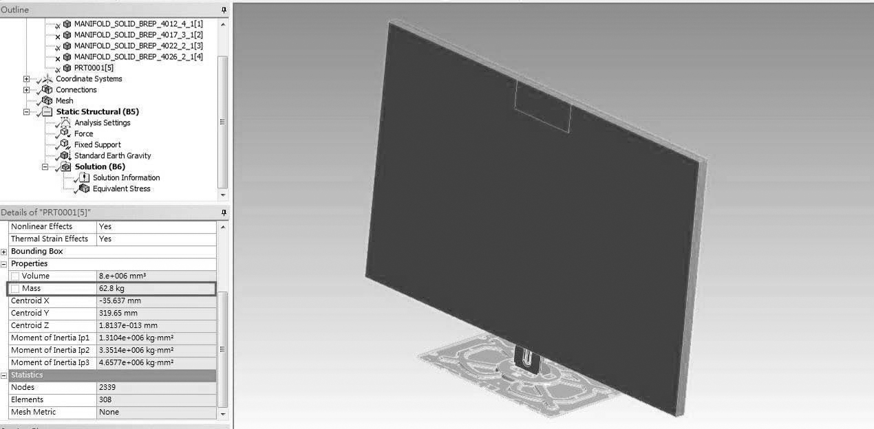 上例就属于不对参数合理性进行判断的典型实例。其分析类型和边界条件均无问题,错误在于液晶电视机的质量。一台液晶电视机质量为62.8kg,约为一个成年男子的质量,这显然是不合常理的。如果将液晶电视机的质量换成合理的数据,就会发现上例计算后,是否添加重力加速度对整个模型的影响甚微。