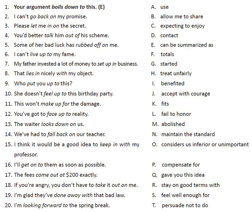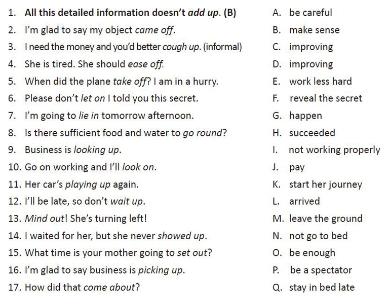 Match these verb phrases (1-17) with the explanations on the right (A-Q) after you have tried to explain them in your own way.