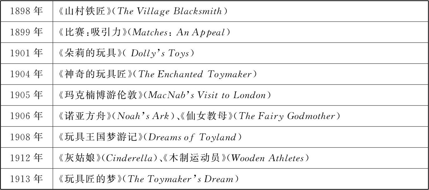 1899年他拍摄了动画短片《比赛:吸引力》(Matches:AnAppeal),这部短片是为政府发动市民为军队募捐而制作的宣传片。1904年他创建了阿尔发培训公司(Alpha Trading Company),为客户制作真人与动画短片。该公司是早期英国电影工业极其罕见的集制作、发行、展映于一身的机构(1927年被大火烧毁)。1904—1909年间,他一直与罗伯特·W.保罗(Robert W.Paul,1869—1943)合作制作真人与定格动画相结合的科幻题材短片。1908年,亚瑟·墨尔本·库珀与罗伯特·W.保罗联合导演了《玩具王国梦游记》(Dreams ofToyland),这部真人与玩具相结合的黑白定格动画默片表现了一个孩子充满玩具的美好梦境,成为世界动画史上不可不提的经典案例。导演在户外利用日光进行拍摄,这无疑使影片质量有所下降,但是从这部古董级的短片中依旧可以看出偶的流畅动作与导演营造的神秘气氛。