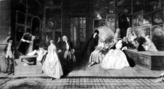 18世纪,法国的艺术取代了意大利成为欧洲文化的主角,洛可可风格逐渐取代了巴洛克艺术风格,而美学作为一门学科也诞生了。“洛可可”一词源于法语,它的含义是贝壳形。洛可可艺术风格产生于法国,是路易十五时期宫廷贵族所崇尚的,反映了他们追求奢侈生活的现状。墙面、家具、器物等的装饰花纹常常带有C形、S形、漩涡形等线条装饰,具有华丽、柔美和繁缛的特点。洛可可艺术在绘画上摆脱了学院派的束缚,绘画题材多见轻松活泼的爱情主题,样式新奇。法国画家让·安东尼·华多 (Jean-A ntoine Watteau,1684—1721)作为洛可可艺术风格的代表,他的绘画风格影响着整个法国,作品优美自然,创造了抒情主义的绘画风格。华多的作品观察细致入微,素描作品技巧运用娴熟。他的绘画作品多表现贵族的享乐生活、谈情说爱等,但是也会暗含贵族在精神上的空虚,因此,他的作品非常真实,具有现实主义色彩。华多的代表作品有《发舟西苔岛》《热尔森画铺》等。图1-25所示为华多的作品《热尔森画铺》,画面中展现了贵族在选画的场面,对他们的服饰、动态都进行了深入的刻画。