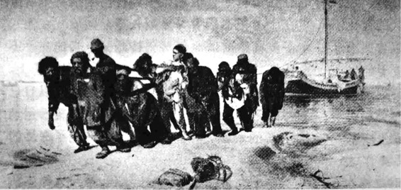 俄国19世纪后半叶最有影响的艺术大师之一伊里亚·叶菲莫维奇·列宾(Ilya Yafimovich Repin,1844—1930)擅长各种题材的绘画,他创作了大量的历史画和肖像画,展现了俄国社会生活的全貌。他曾说,“通过历史画,为痛苦的悲剧寻找出路。”他的画面构图丰富多变,画家用画面的色彩、线条和人物的布局吸引着我们的注意力,凡是看过这幅画的人都为它的生活真实而感到惊讶,他的作品充分反映了人们的生活和理想。列宾的代表作品有《伏尔加河上的纤夫》《索菲亚公主》《伊凡·雷帝杀子》等。图1-31所示为列宾的作品《伏尔加河上的纤夫》,这幅名画是列宾学生时代的作品,表现了饱经风霜的纤夫步履艰难地拉着纤绳的场面,根据画面构图和前后的虚实对比表现了深远的空间效果。
