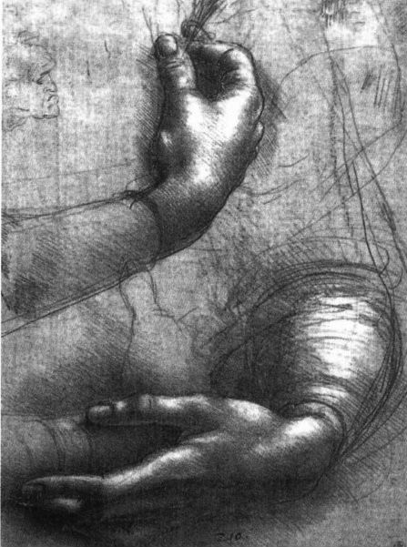 文艺复兴鼎盛时期出现了三位艺术巨匠,他们是达·芬奇、米开朗基罗和拉斐尔,被世人称为“三杰”,对后世的绘画艺术发展产生了深远的影响。列奥那多·达·芬奇(Leonardo Di Ser Piero Da Vinci,1452—1519)是一位卓越的建筑师、画家、解剖学家、数学家、雕塑家、工程师、科学家。他将绘画与科学研究相结合,达·芬奇为了了解人体的骨骼、肌肉,开始进行人体解剖,成为世界上较早从事人体解剖的人之一。他对人体解剖和透视进行了深入的研究,用圆形、正方形去表示人体比例,并使用数学的方法对人体比例进行刻画。正因如此,达·芬奇笔下的肖像作品骨骼、肌肉、比例才会造型如此准确。达·芬奇的素描功力超群,构图严谨,能够表达人物的内心情感,他的作品极富表现力。他创造了“空气远近法”,物体越远,就越会隐没在淡蓝色的雾气中。达·芬奇的代表作品有《蒙娜丽莎》《最后的晚餐》和《岩间圣母》。图1-16所示为达·芬奇的油画肖像《蒙娜丽莎》,蒙娜丽莎那发自内心的神秘微笑,深深感染着每一位观者。作品在背景的处理上采用了空气透视法,那柔和的天空、层叠的山峰烘托了人物的神秘色彩。另一幅作品《最后的晚餐》绘制在圣·玛利亚·德尔·格拉契修道院的墙壁上,达·芬奇将画面中的每个人物都刻画出了不同的表情、性格和姿态。画中人物按照几组来刻画,身体和手臂互相穿插,在画面整体统一的同时又有变化。图1-17所示为达·芬奇的《手的习作》,作品体现了其深厚的艺术功底。