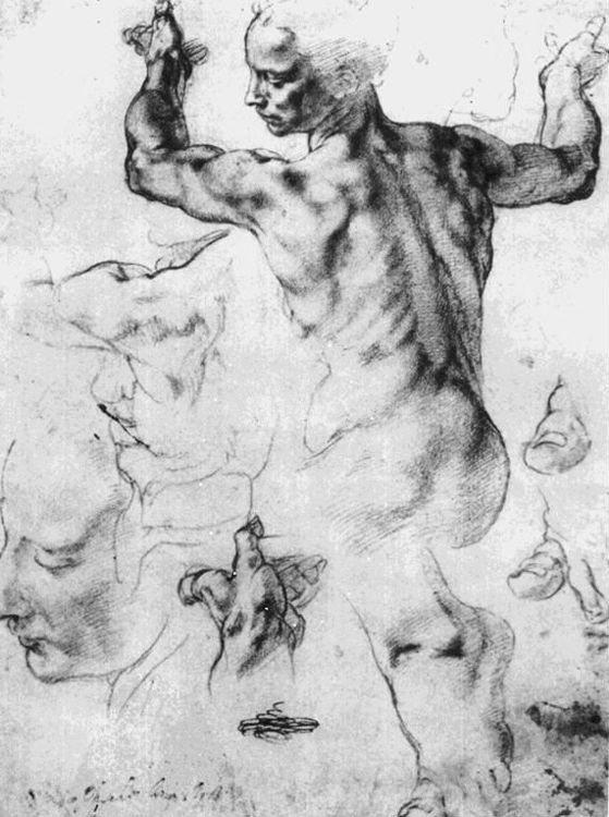 米开朗基罗·波纳罗蒂(Michelangelo,1475—1564),是意大利伟大的建筑师、画家、雕塑家和诗人,他的作品汲取了古希腊、罗马艺术的精髓,结构准确,画面整体气势宏大,极具个性和浪漫主义色彩。与达·芬奇追求理性、含蓄和柔美的不同之处在于,米开朗基罗注重画面的雄伟浑厚、富有激情。在绘制人体时有其特有的表现语言,绘制得非常雄壮、结实,在表现女人体时,也用男人体的强壮来塑造。米开朗基罗的代表作品有《哀悼基督》《最后的审判》《创世纪》等。图1-18所示为米开朗基罗的素描作品《利比西巫女》,作品中体现出不平静、痛苦和矛盾的心情。