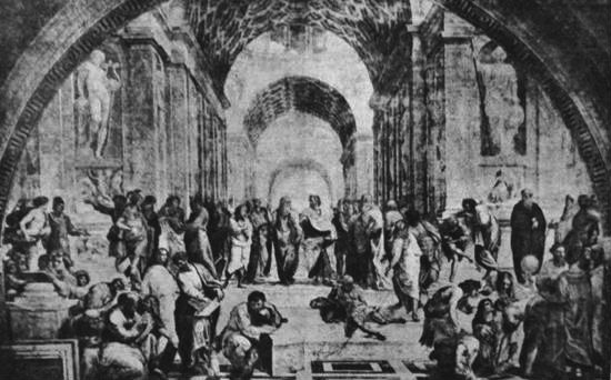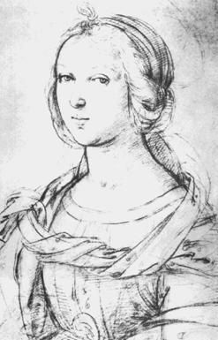 拉斐尔·圣齐奥(Raffaello Sanzio,1483—1520),他是著名的意大利建筑师、画家。他的作品在继承达·芬奇和米开朗基罗画风的基础上,逐渐形成了优雅、秀丽的表现语言,并使人文主义思想在作品中得到充分的展现。拉斐尔的作品有着古典之美,又有着灵动的活力。他的作品表现《圣经》故事和古希腊神话较多,带有一定的宗教色彩。作品灵感多来源于现实生活,将现实的美进行提炼来表现内心理想的情感。拉斐尔的素描作品线条柔美、流畅,刻画得非常深入。他的作品善于表现空间,并能够与建筑内部有机的结合。拉斐尔的代表作品有《雅典学院》《椅中圣母》《西斯庭圣母》《教皇利奥十世和主教》。他的人物肖像画,不仅注重外貌的酷似,更关注于内心世界的表现,是学院派古典主义所遵循的典范。图1-19所示为拉斐尔的人像素描作品,画中简单的线条描绘出传神的人像作品。图1-20所示为拉斐尔的作品《雅典学院》,作品将柏拉图、亚里士多德、苏格拉底、狄奥古尼、阿基米得等不同时期的众多学者表现在同一幅画中,其中也包括画家本人,整个画面表现出学者间为了追求科学和真理而辩论的人文主义思想。