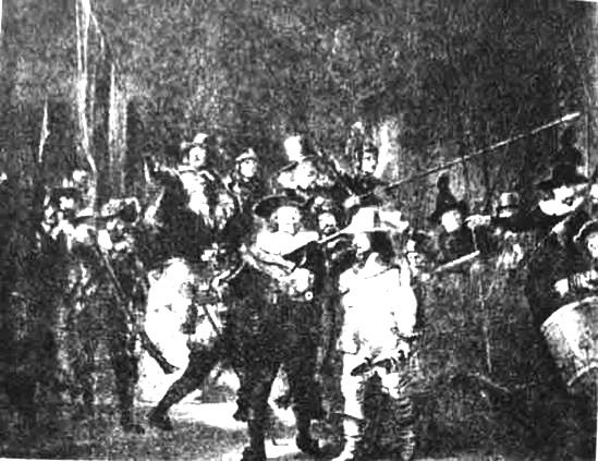 伦勃朗·哈尔曼松·凡·莱因(Rembrandt Harmenszoon van Rijn ,1606—1669)是一位油画家、版画家,也是荷兰最伟大的画家之一,他的作品构思巧妙、深刻,物体的光影变化充分,体积感很强。其晚年作品多用毛笔绘制,运笔粗犷。伦勃朗善于画肖像画,他的肖像画笔触豪放有力。他一生共画了600余幅油画, 350幅版画, 1500余幅素描,其作品体现了古典主义意境和真实的生活感受。并且他还画了大量的自画像,成为其人生发展的一个缩影,从他的自画像中可以看到,他的人生从欢快走向痛苦,体现在他晚年的艺术中给人一种沉痛的悲剧力量。他的代表作品有《杜普教授的解剖课》《怀抱萨斯基亚的自画像》《夜巡》《圣乔治民团的宴会》等。图1-24所示为伦勃朗的作品《夜巡》,画面中细致刻画了每个人的动作和表情,体现了画家在群画像方面的才能。