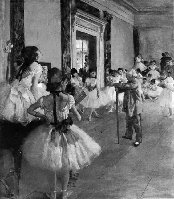 印象主义揭开了西方现代绘画的帷幕,代表画家有马奈、莫奈、德加、雷诺阿、毕沙罗等,他们以多变的线条和光影替代了利用轮廓线来表现体积感的素描表现手法。其中埃德加·德加(Edgar Degas,1834—1917)在素描领域最为出色,他主张“所谓素描不是表现形态,而是表现对形态的看法。”素描从表现客观世界到表现主观观念的方向演变,构图与众不同,既有局部特写又具偶然性。他的绘画题材有芭蕾舞女演员、赛马、酒吧、剧场等,他的肖像画展现了素描技巧的运用和细致入微的表现。德加将传统素描与印象派色彩巧妙的结合,他也曾说他自己是“运用线条的色彩画家”。德加的代表作品有《贝利尼一家》《会计师和女儿们》《舞蹈教室》《调整舞鞋的舞者》等。图1-28所示为德加的作品《舞蹈教室》,画面抓住了她们瞬间形体和动作的变化效果,他借助色粉笔用素描的手法来表现。