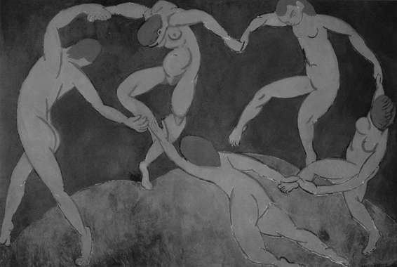 野兽派诞生于法国,是一种自觉的前卫派艺术运动。代表人物马蒂斯、德兰、弗拉芒克、马尔克等画家的作品具有表现性的构图、过度扭曲夸张的造型、加强的轮廓线、鲜明的色彩对比的特点。作为野兽派创始人的亨利·马蒂斯,是一位画家、雕塑家,在素描肖像上的成就超群。他极力将画面表现得简洁,对很多的细节进行了简化,常用线描来传达情感,并且善于用曲线来进行表现,画面整体感觉十分饱满。他在表现画面空间关系时也很有特色,不使用透视的方法,而是利用前后遮挡的物体试图表现出某种空间层次感。马蒂斯的代表作品为《带绿色条纹的肖像》《红色的和谐》《蓝色的裸体》等。图1-32所示为马蒂斯的作品《舞蹈》,画面中以简洁的线条展现了人的动态,描绘得十分生动。