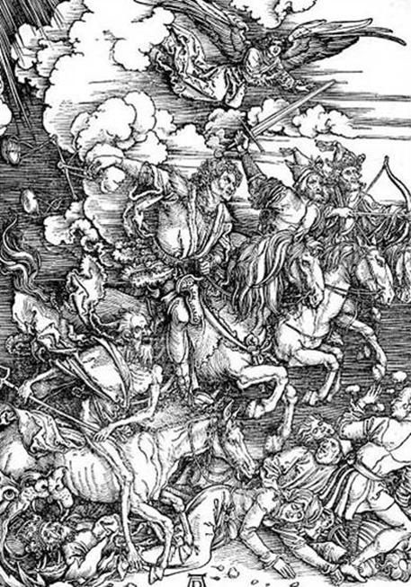 丢勒、荷尔拜因也是文艺复兴时期杰出的代表人物,他们的素描作品有其各自的特点和风格。阿尔布雷特·丢勒(Albrecht Dürer,1471—1528)是德国的画家、版画家,他对素描进行了深入的研究,尤其是人体比例结构、解剖等方面,其素描作品结构严谨、形象生动,注重人物内心情感的细腻表现。丢勒对于透视、数学、人体解剖等有较为深入的研究,作品体现了新人文主义的精神。他13岁就绘制了素描自画像,且造型准确、刻画细腻。丢勒认为,“美的源泉不仅在于事物本身,而且也存在于艺术家对待事物的态度上。”他是一位勤奋且多产的画家,现存的素描作品就达1700余幅。他的素描、油画、版画作品基本上都是宗教题材,明暗层次丰富,质感表现到位。丢勒的代表作品有《启示录》《亚当与夏娃》《奥斯瓦尔德·克雷尔肖像》和《四使徒》等。图1-21所示为丢勒的作品《四骑士》,画中四骑士策马狂奔,气势磅礴,表现了画家强大的艺术表现力。