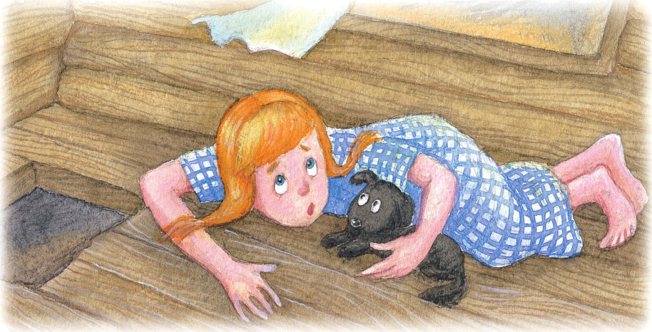 But Toto jumped out of Dorothy's arms and ran under the bed. Toto was her little black dog. Dorothy tried to catch him. Aunt Em climbed down into the small dark place under the floor, and called to Dorothy to come. But the wind blew very hard against the house and Dorothy fell on the floor, with Toto in her arms.