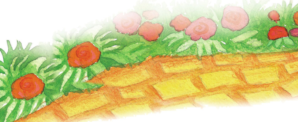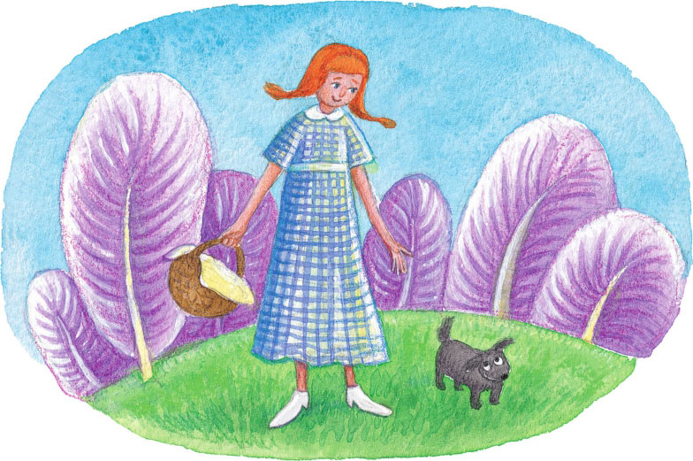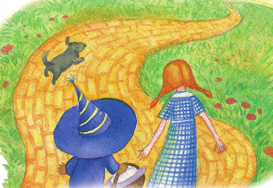 Dorothy and Toto soon found the yellow brick road and walked along it, past the green fields and the blue Munchkin houses.