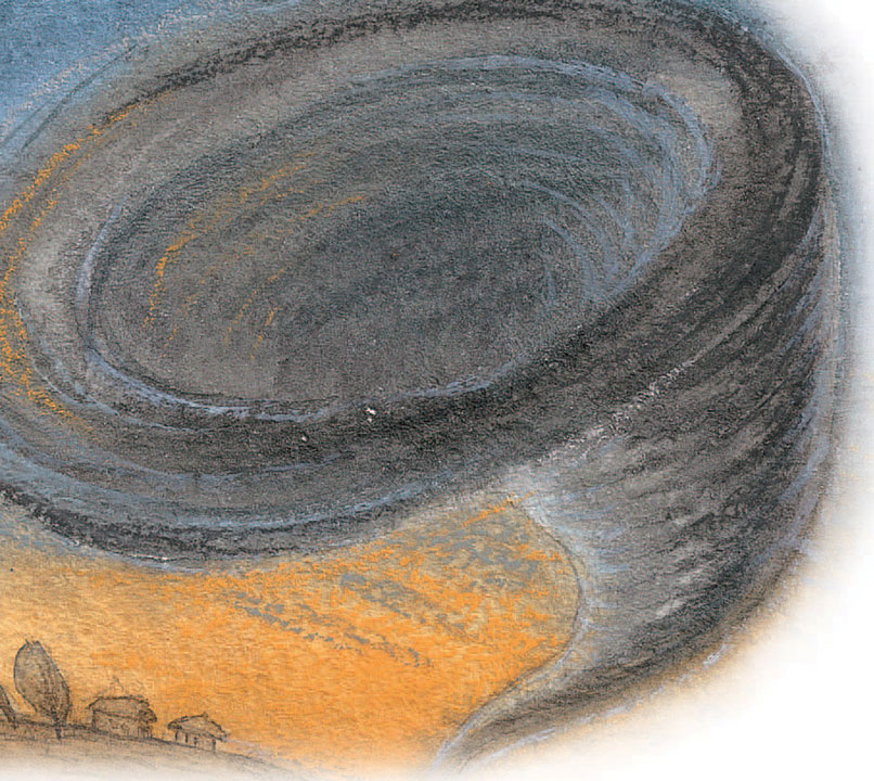"There's a big wind coming, Em," he said to his wife. "I'm going to look after the animals. Take Dorothy into the hole, quickly."