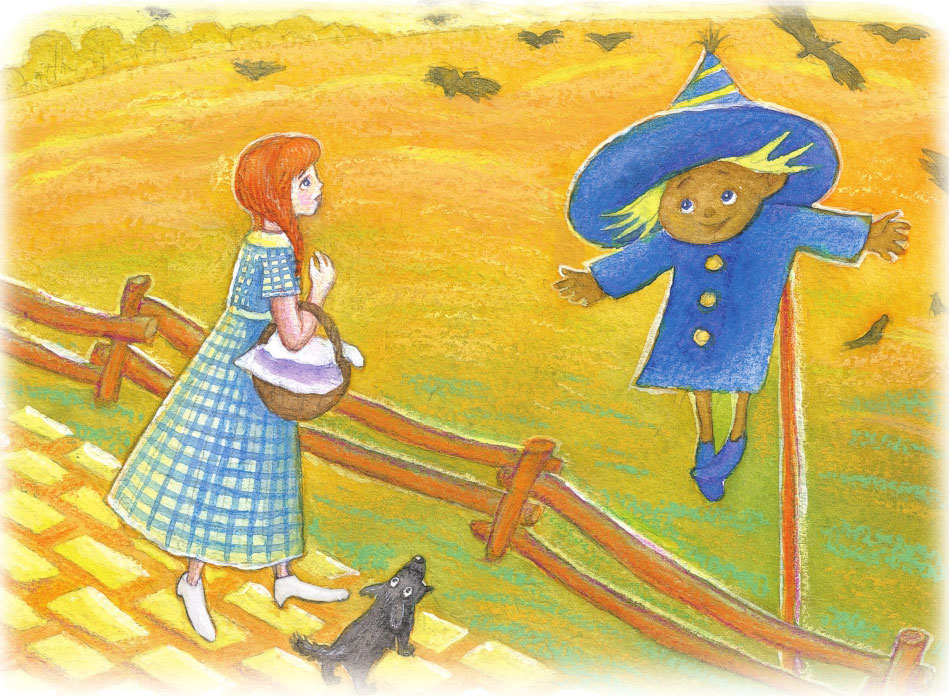 "Poor Scarecrow!" said Dorothy. "Come with me to the Emerald City, and ask the Great Oz for some brains!"