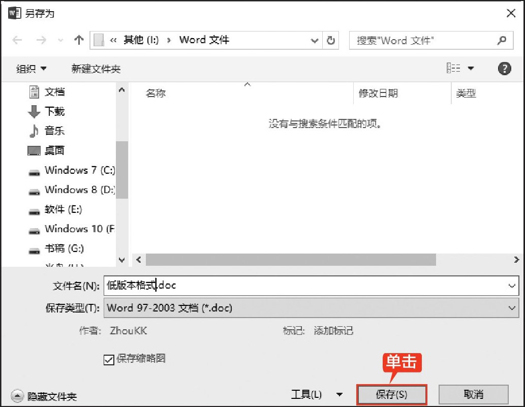 第2步 弹出【另存为】对话框,在【保存类型】下拉列表中选择【Word 97-2003文档】选项,单击【保存】按钮即可将其转换为低版本。之后,即可使用Word 2003打开。
