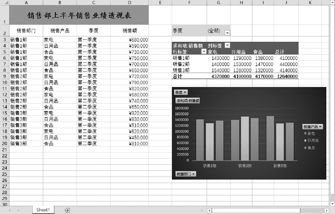 在市场营销领域,可以使用Word 2016制作项目评估报告、企业营销计划书等;使用Excel 2016制作产品价目表、进销存管理系统等;使用PowerPoint 2016制作投标书、市场调研报告PPT、产品营销推广方案PPT、企业发展战略PPT等。下图所示为使用Excel 2016制作的销售业绩工作表。