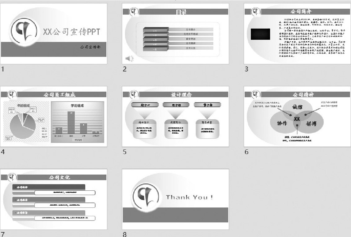 在行政文秘管理领域需要制作出各类严谨的文档。Office 2016系列办公软件提供有批注、审阅以及错误检查等功能,可以方便地核查制作的文档。如使用Word 2016制作委托书、合同等;使用Excel 2016制作项目评估表、会议议程记录表、差旅报销单等;使用PowerPoint 2016可以制作公司宣传PPT、商品展示PPT等。下图所示为使用PowerPoint 2016制作的公司宣传PPT。
