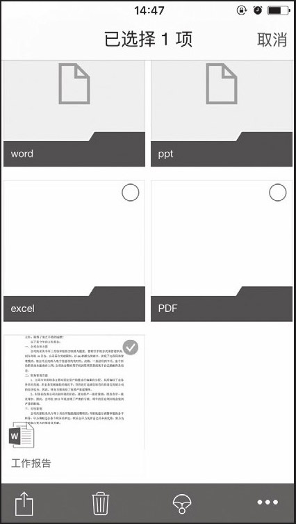 第3步 长按“工作报告”图标,即可选中文件并调出对文件可进行的操作命令。