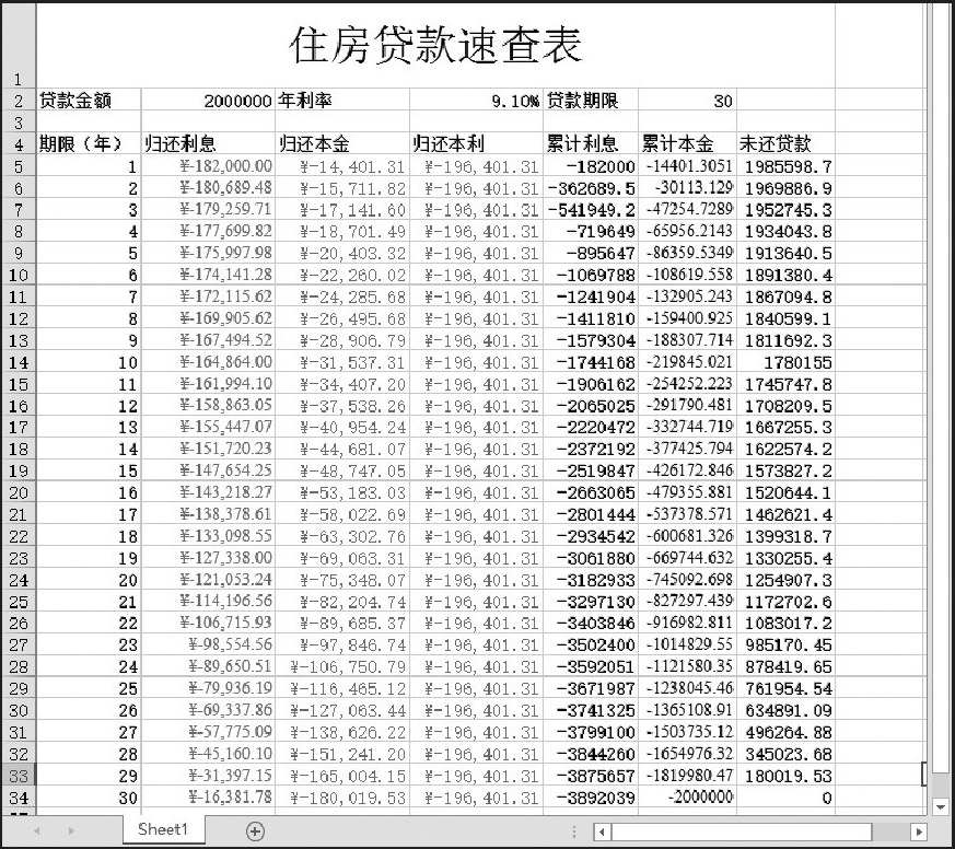 财务管理是一项涉及面广、综合性和制约性都很强的系统工程,通过价值形态对资金运动进行决策、计划和控制的综合性管理,是企业管理的核心内容。在财务管理领域,可以使用Word 2016制作询价单、公司财务分析报告等;使用Excel 2016可以制作企业财务查询表、成本统计表、年度预算表等;使用PowerPoint 2016制作年度财务报告PPT、项目资金需求PPT等。下图所示为使用Excel 2016制作的住房贷款速查表。